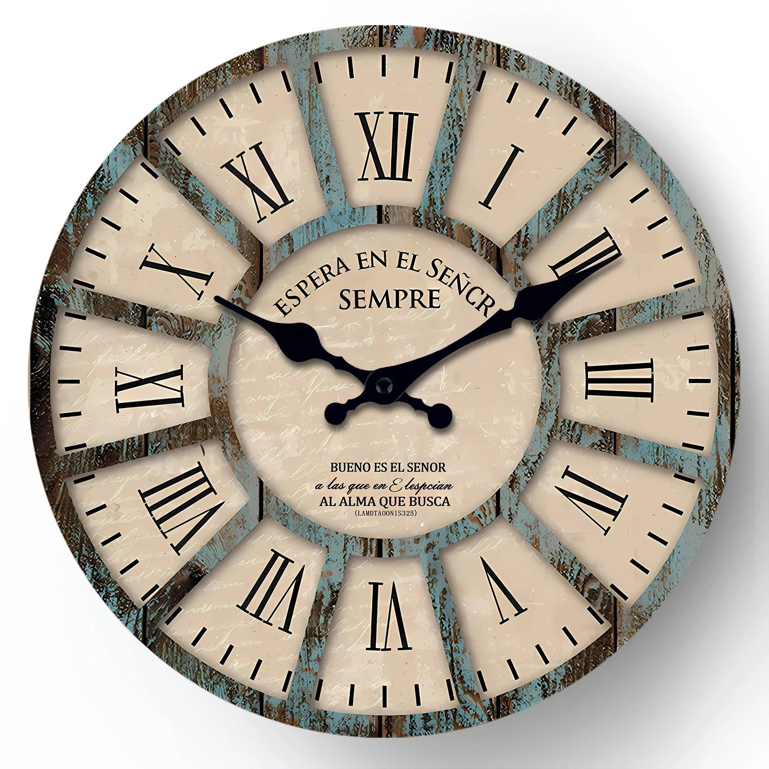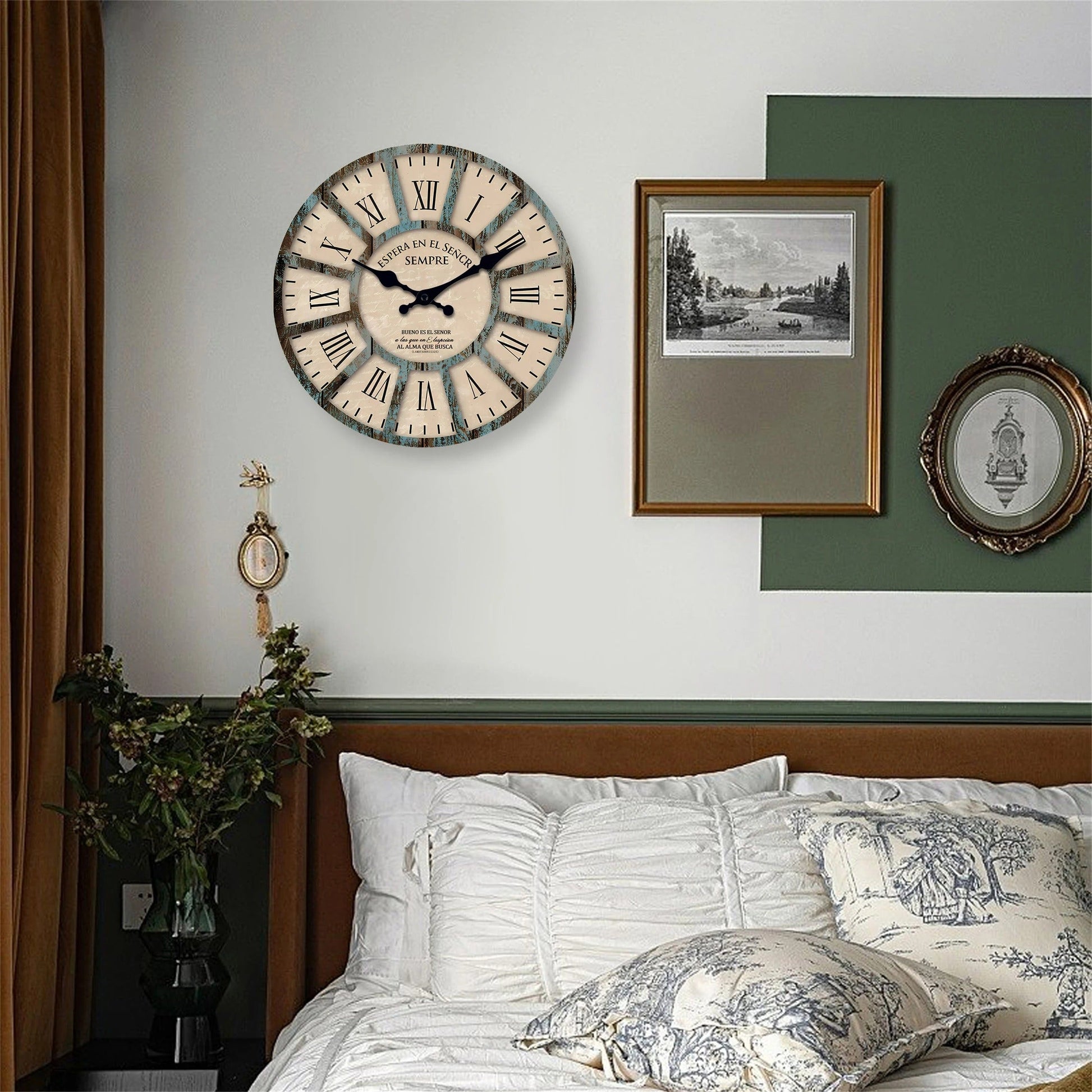 Breng een vleugje rustieke charme in huis met deze prachtige houten wandklok met Romeinse cijfers. Het authentieke ontwerp en het natuurlijke materiaal zorgen voor een perfecte balans tussen traditie en modern design. De grote zwarte Romeinse cijfers springen mooi naar voren op de licht verweerde houten achtergrond, waardoor je interieur direct een warme en gezellige sfeer krijgt — ideaal voor woonkamer, eetkamer of kantoor.