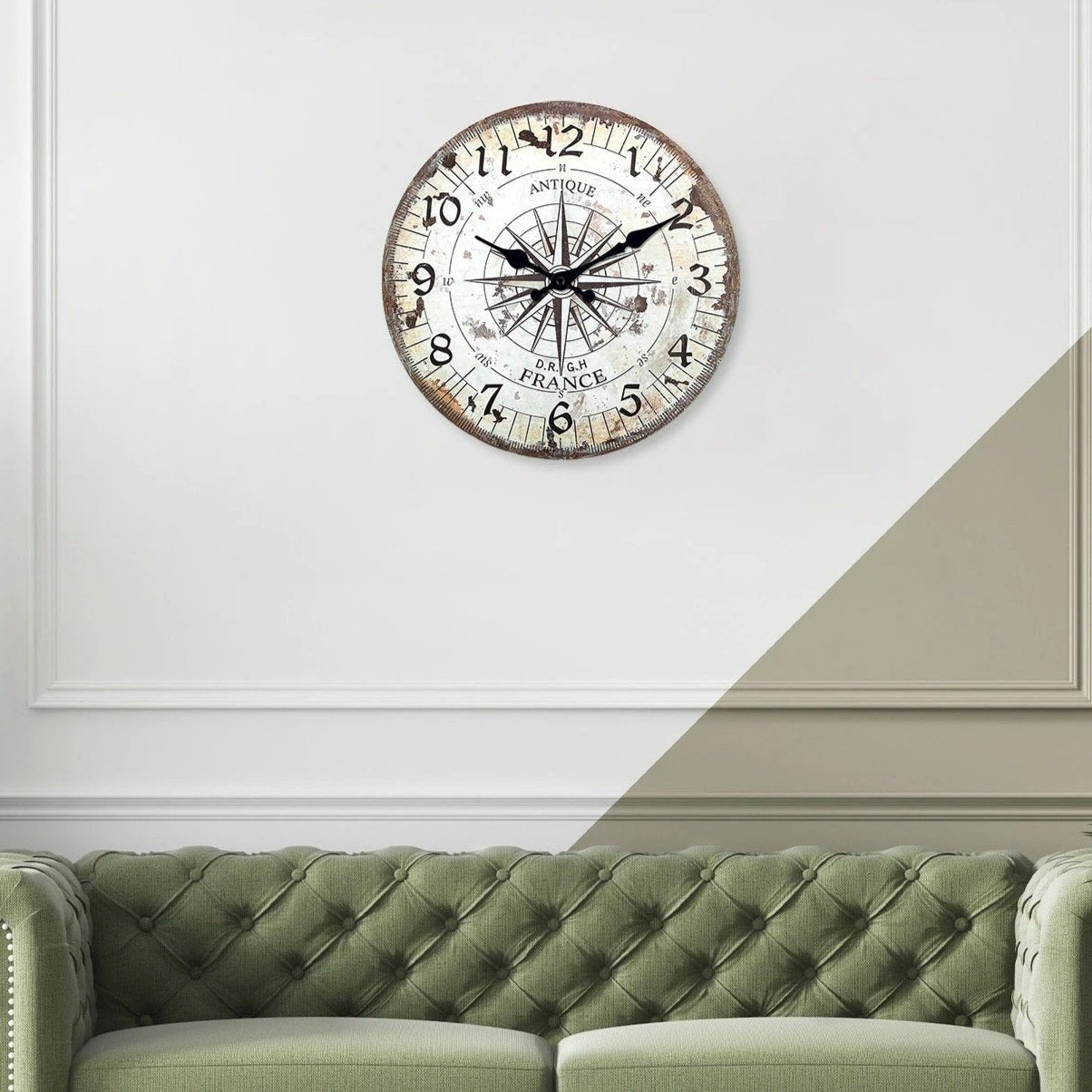Het antieke wijzerplaatdesign met kompasmotief en verweerd effect zorgt voor een authentieke, tijdloze uitstraling. De combinatie van natuurlijke houttinten en subtiele slijtagesporen maakt deze klok een opvallend decoratiestuk dat vintage charme én moderne uitstraling samenbrengt.