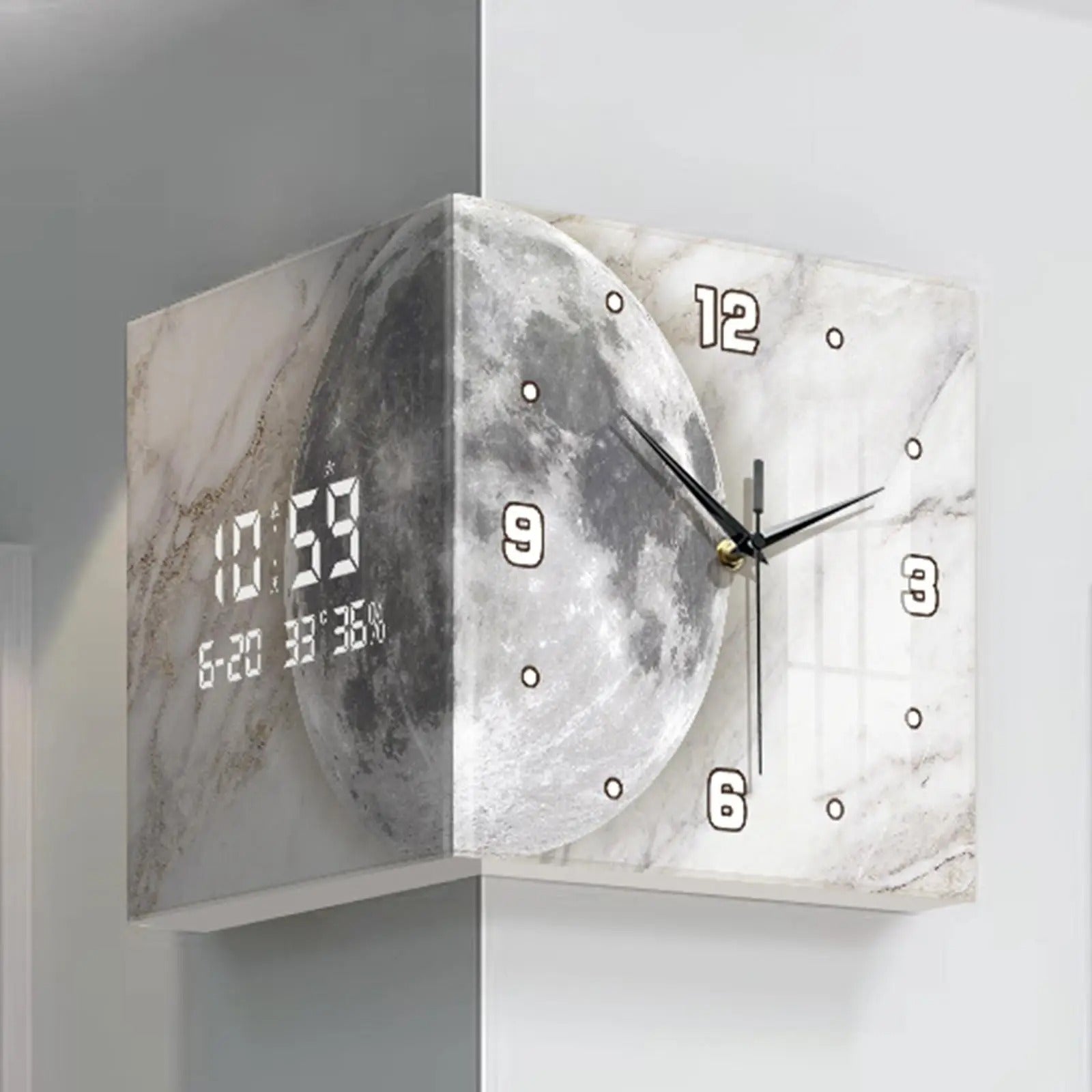 Conçue comme une horloge d’angle, elle offre deux cadrans visibles simultanément, permettant de lire l’heure depuis deux pièces ou deux directions différentes. Son style unique allie modernité et praticité, tout en restant assez neutre pour s’intégrer dans un salon, une chambre ou un bureau. Le motif lunaire apporte une ambiance apaisante et subtilement futuriste, parfaite pour les amateurs de design original.